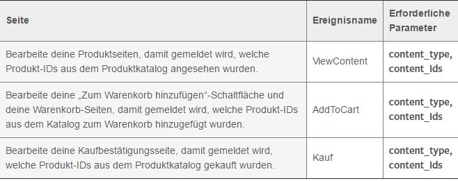 Um dabei allerdings die erforderlichen Daten zur genauen Wiederansprache zu erhalten, muss das Facebook-Pixel auf den entsprechenden Seiten verändert werden. Zusätzlich zu dem Code, der auf jeder Seite der Website eingefügt ist, benötigen die Dynamic Ads drei benutzerdefinierte Datenereignisse, die zu verschiedenen Seiten der Website hinzugefügt werden: