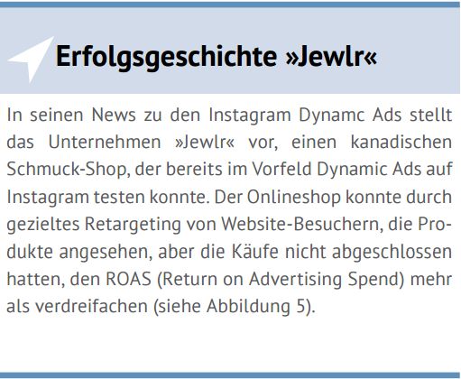 erfolgMit dem neuen Anzeigenformat lassen sich zukünftig auch bei Instagram gezielt interessante Produkte noch einmal genau den interessierten Nutzern zu einem definierten Zeitpunkt anzeigen. Ganz praktisch bedeutet dies, dass ein Website-Besucher, der die Shop-Seite oder die App besucht hat, später mit einer (oder mehreren) passenden Produktanzeige(n) noch einmal auf Instagram angesprochen werden kann. Wie viele schon aus dem Facebook Newsfeed kennen, ist die Werbung dabei passgenau. Man besucht einen Shop, schaut sich bestimmte Produkte wie zum Beispiel einen Pullover an und bekommt diesen dann wenig später noch einmal – vielleicht sogar mit einer passenden Hose, einem Accessoire oder in einer Farbauswahl – angezeigt. Genauso gezielt können nun auch die Instagram Dynamic Ads ausgespielt und dem Nutzer nur die relevanten Produkte vorgestellt werden.