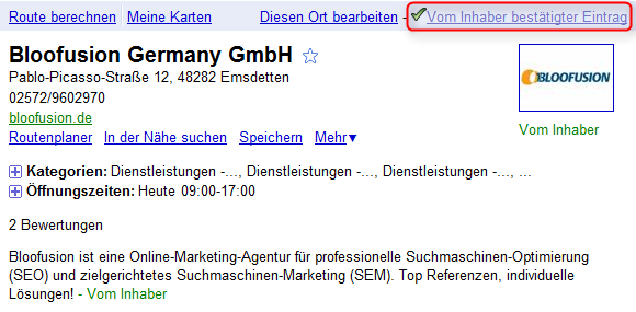 Unternehmen sollten daher darauf achten, dass die Daten auf ihren Places-Seiten korrekt und aktuell sind. Um das zu erreichen, können Unternehmen Places-Einträge übernehmen und die Daten auf diesen Seiten verändern. Erkennbar sind diese Einträge am Text “Vom Inhaber bestätigter Eintrag”:
