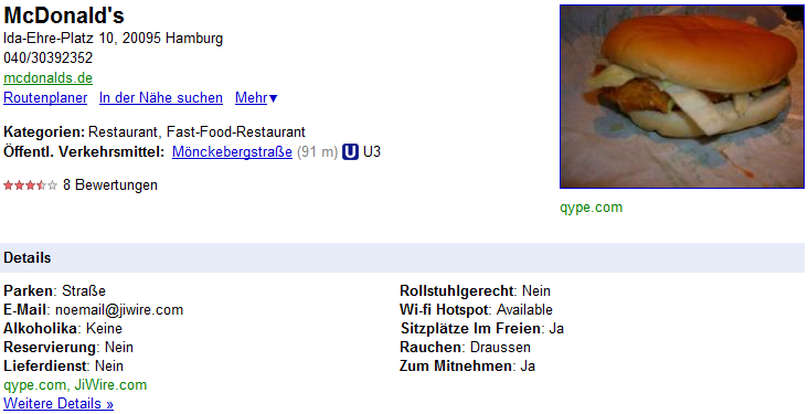 Google übernimmt Daten von anderen Plattformen und fügt sie den Places-Listings hinzu, z. B. Bilder und Bewertungen. Wie am Beispiel zu erkennen, werden dabei auch – wie das unattraktive Bild eines Burgers – Bilder übernommen, die Unternehmen sicherlich nicht auf ihren Profilseiten sehen möchten.
