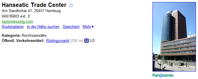 Im Falle der Kanzlei Tayler Wessing versagt das so genannte “Matching”: Google hat Daten unterschiedlicher Quellen falsch zusammengesetzt, so dass das Places-Listing der Kanzlei in Hamburg auf das Hanseatic Trade Center verlinkt.